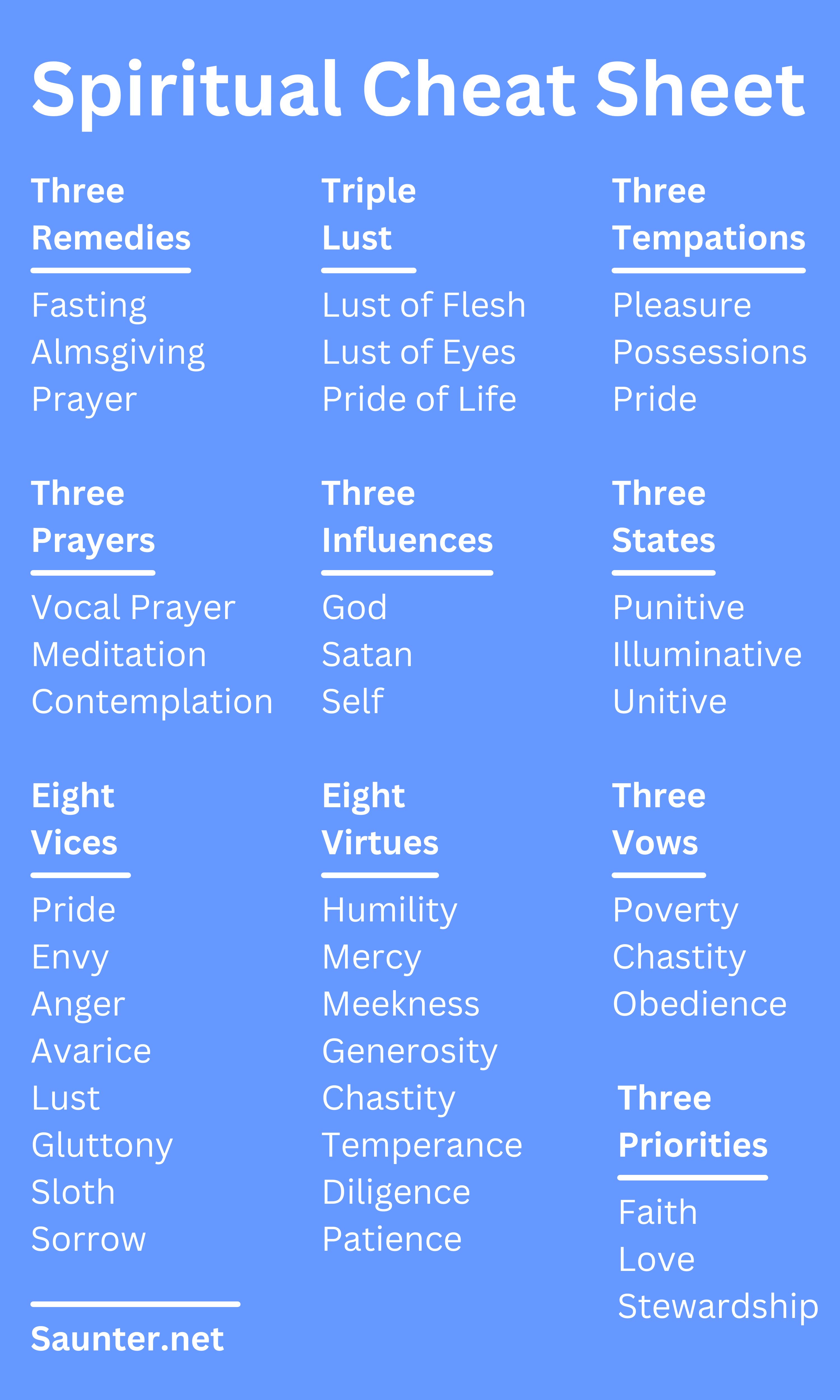 I began working on this for personal use after returning to Christ. Thank you to Dr. Brant Pitre whose Introduction to the Spiritual Life contributed greatly to the concepts and its simplicity.